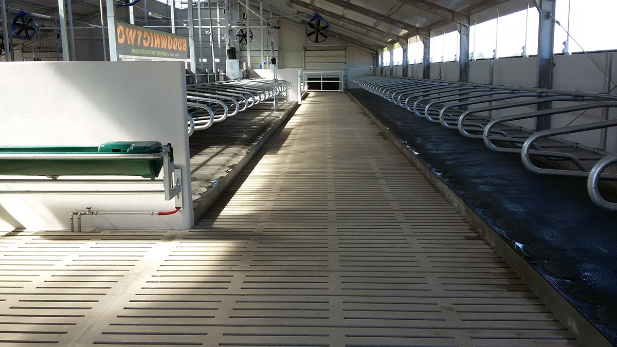 - higiena – płyty legowiskowe dla bydła mogą być ustawione powyżej rusztów, co umożliwia swobody spływ gnojowicy